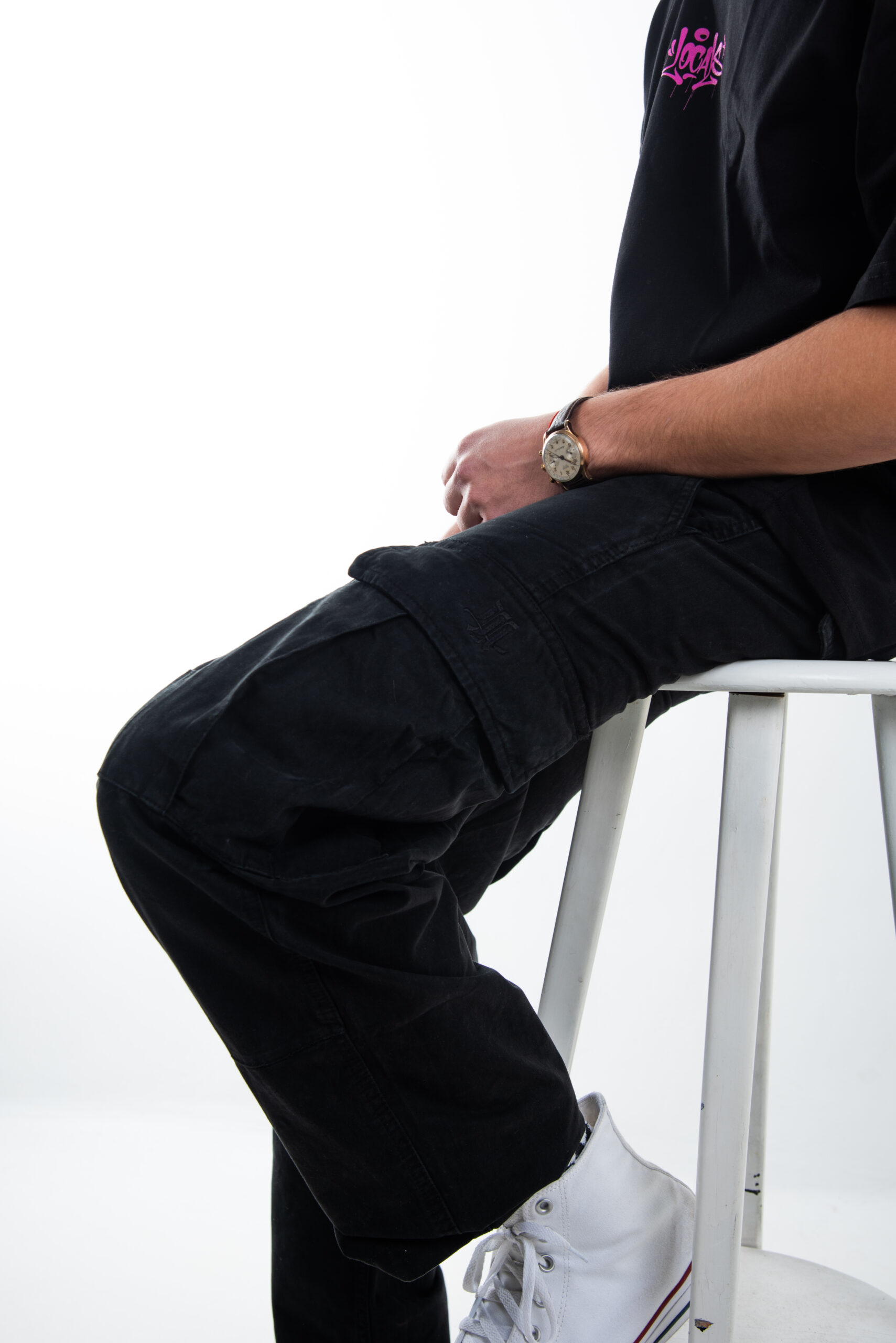 LM cargo trouser in black. Loose fit, unisex with embroidered logo in black.