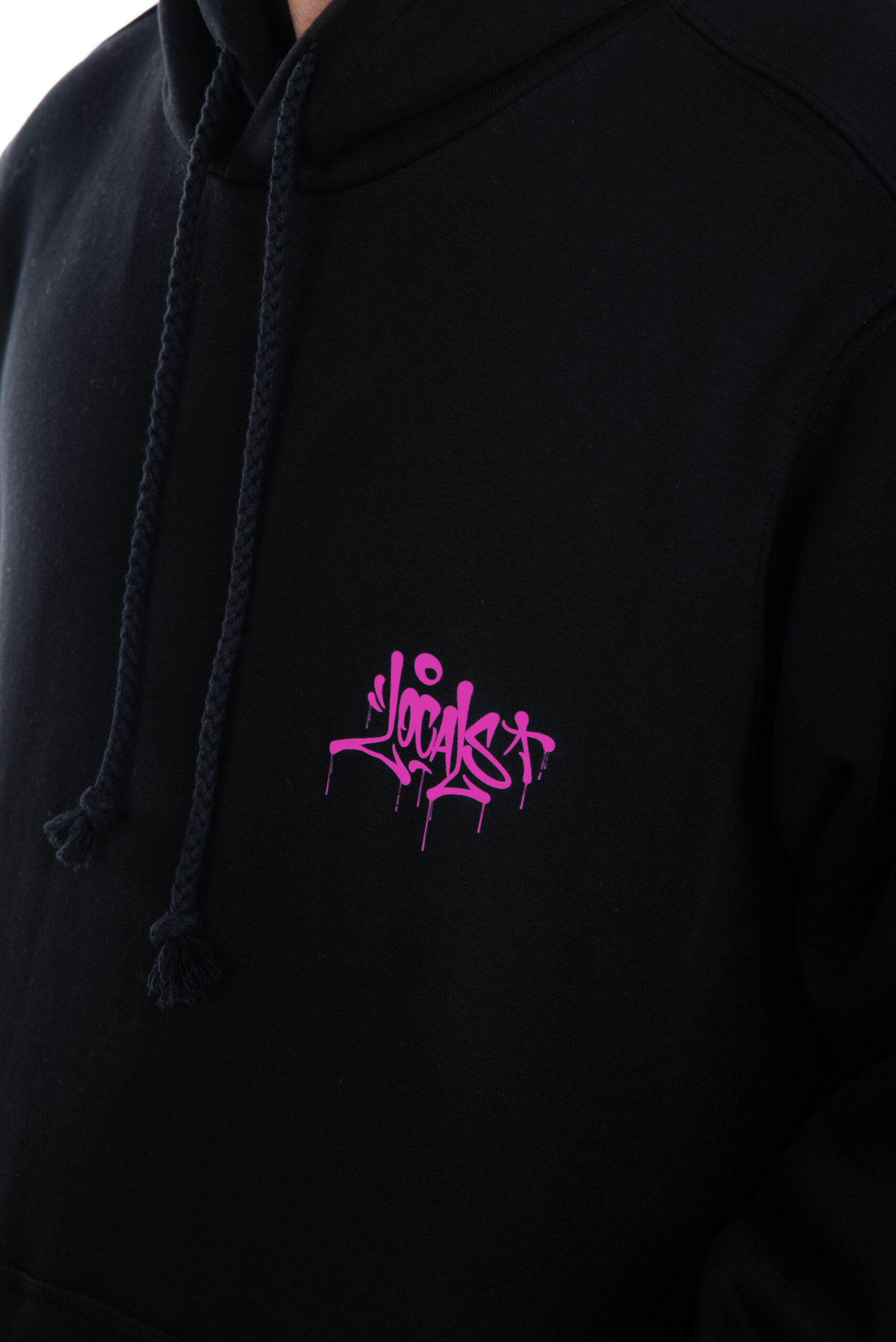 Local Mentality Tag hoodie in Black with Fuchsia logo. 70% cotton and 30% polyester.