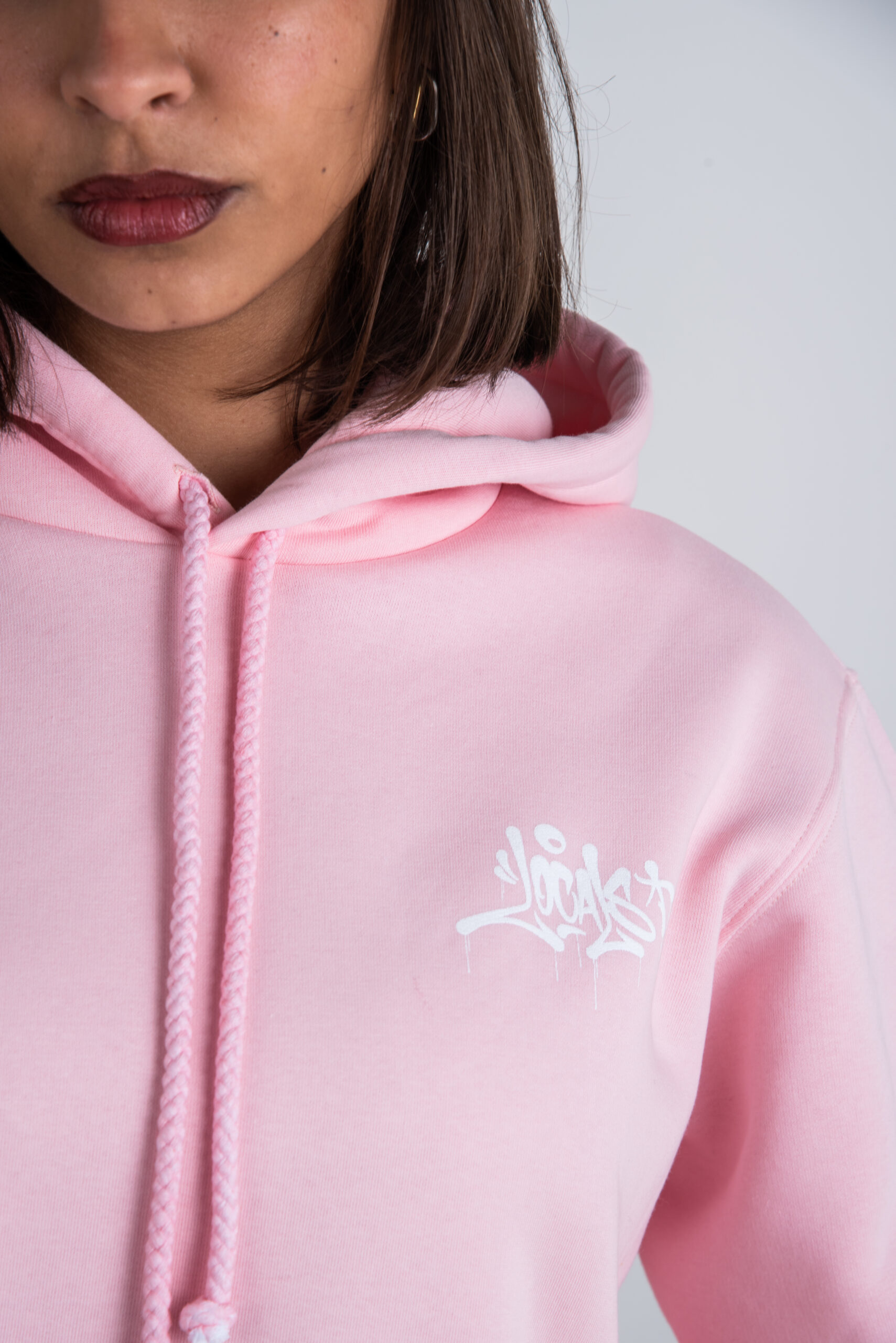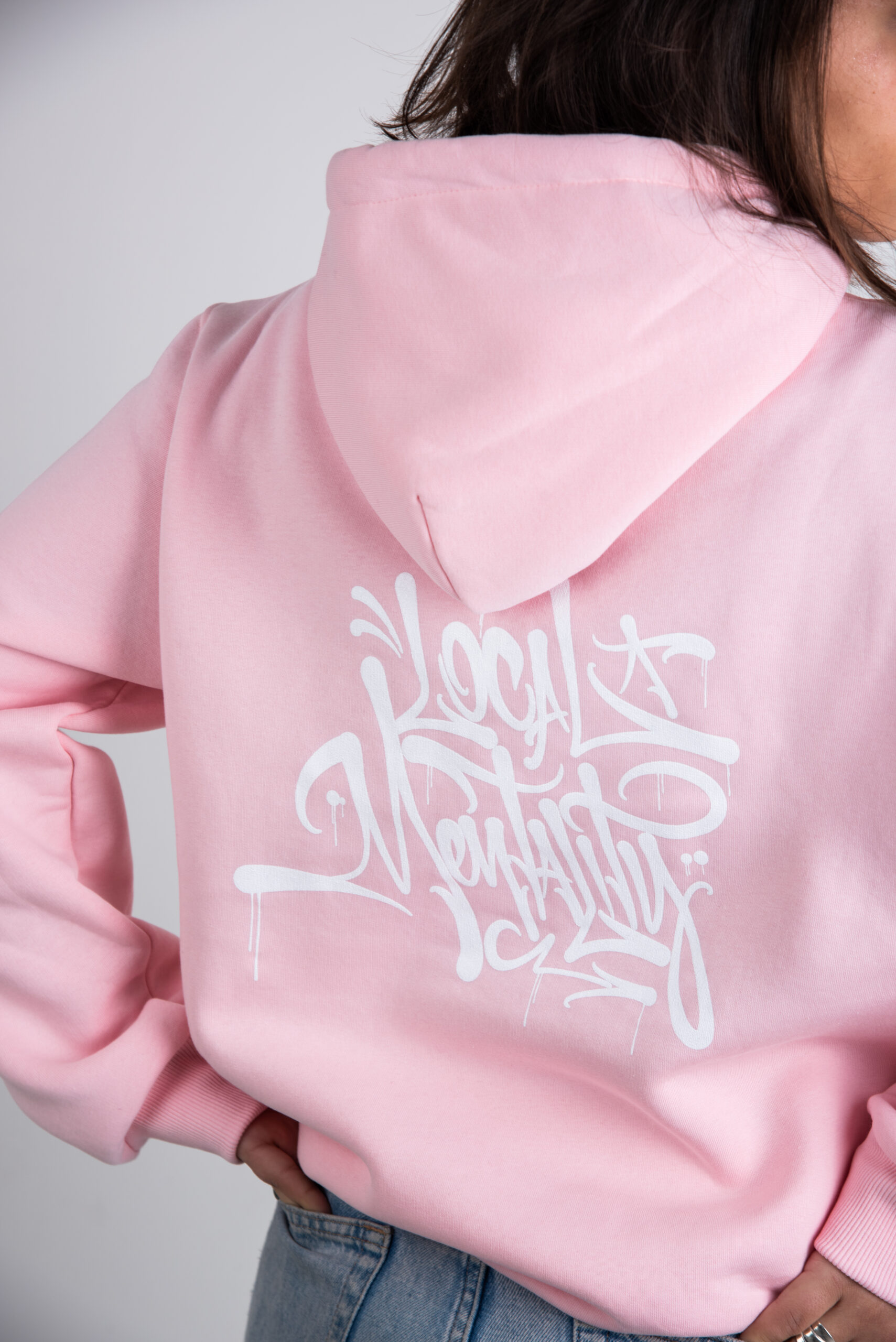 Local Mentality Tag hoodie in Pink with White logo. 70% cotton and 30% polyester.