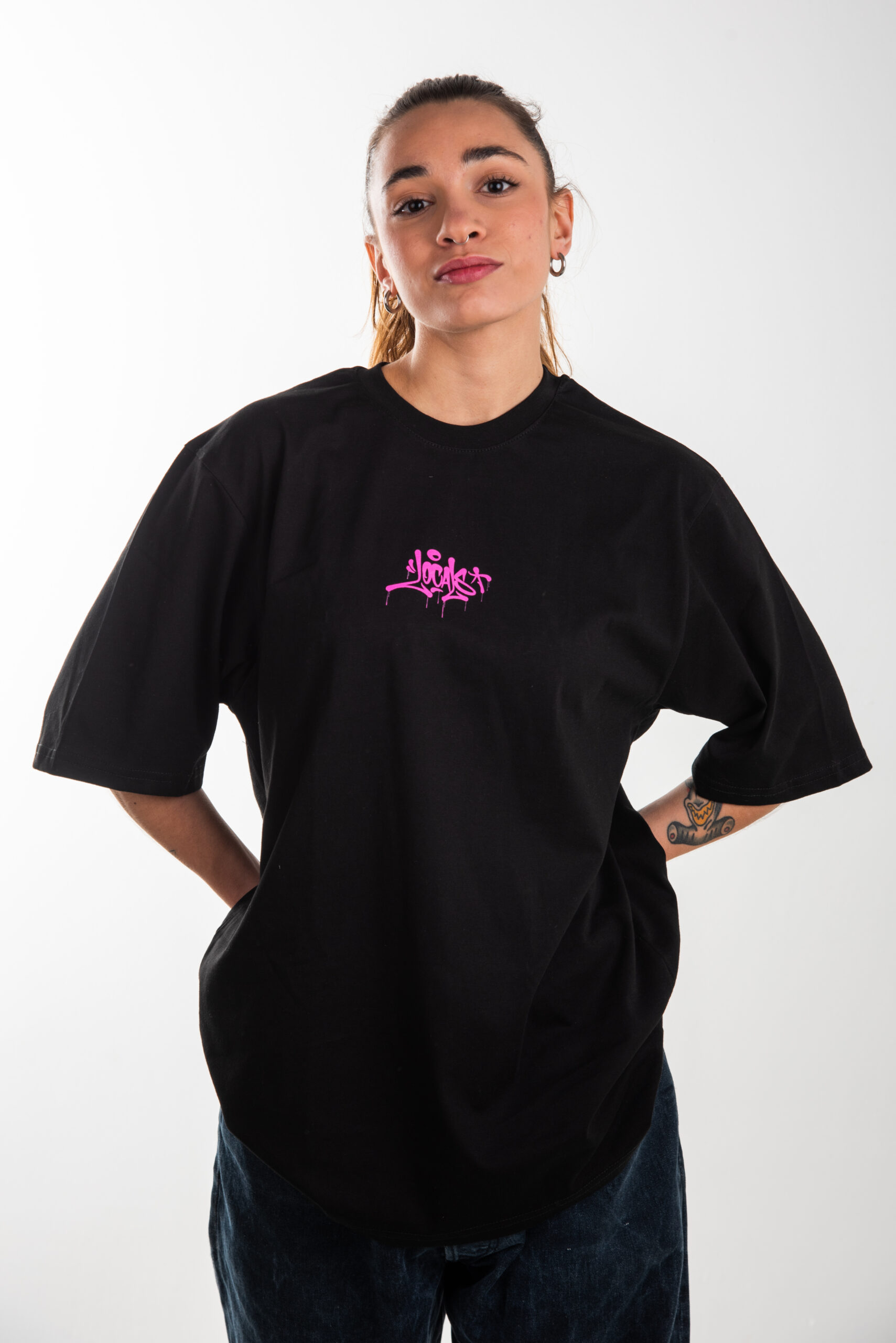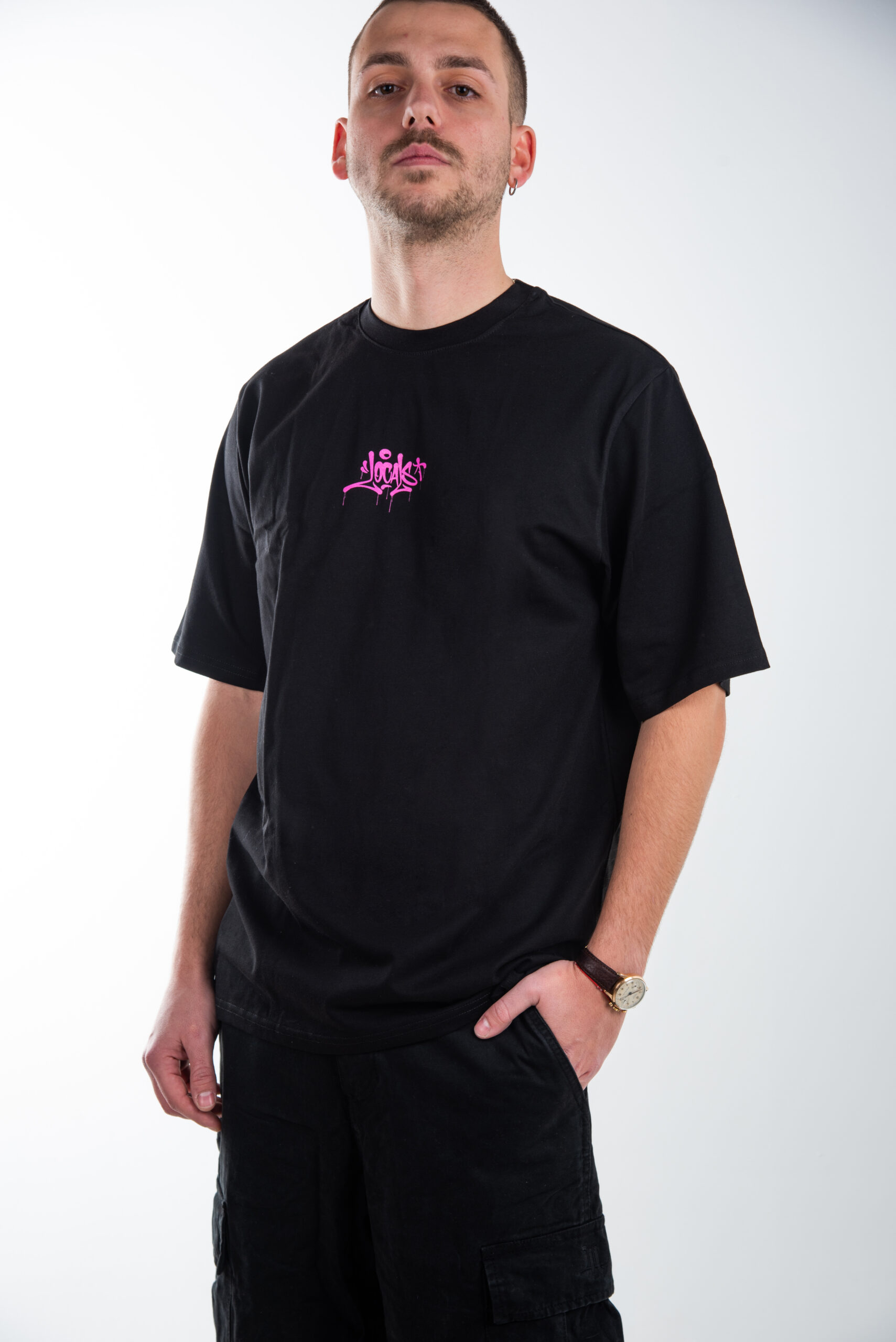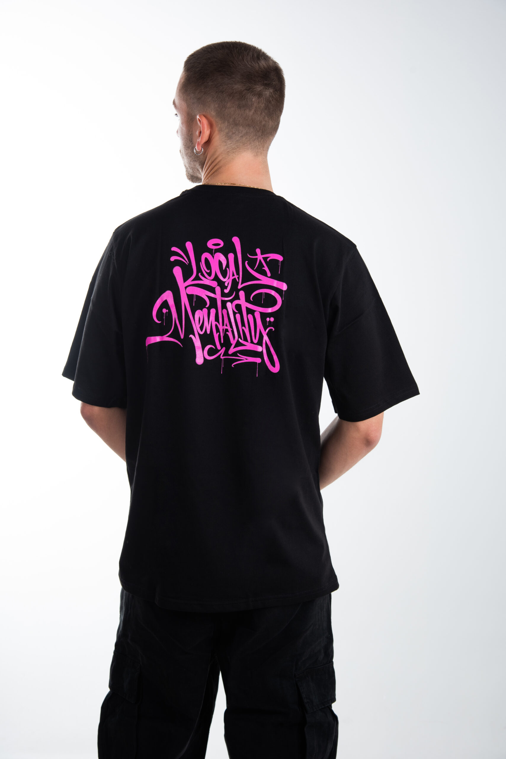 Local Mentality Tag T-Shirt in black with chest and back pink logo.